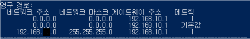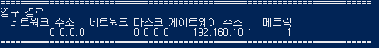 3. 초기에 아무런 설정이 없었다면 영구경로가 다음과 비슷하게 출력 됨. 게이트웨이 주소는 다를 수 있음.