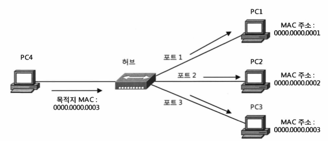 허브는 한 장비에서 전송된 데이터 프레임을 허브로 연결된 모든 장비에게 다 전송하며 이를 플러딩(flooding)이라고 한다.
